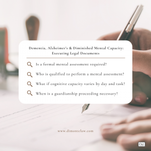 However, when a person has diminished mental capacity, sometimes it can be difficult or impossible to have such documents executed by a patient, resident, client or loved one because they no longer possess the required cognitive capability to sign the documents legally and ethically.