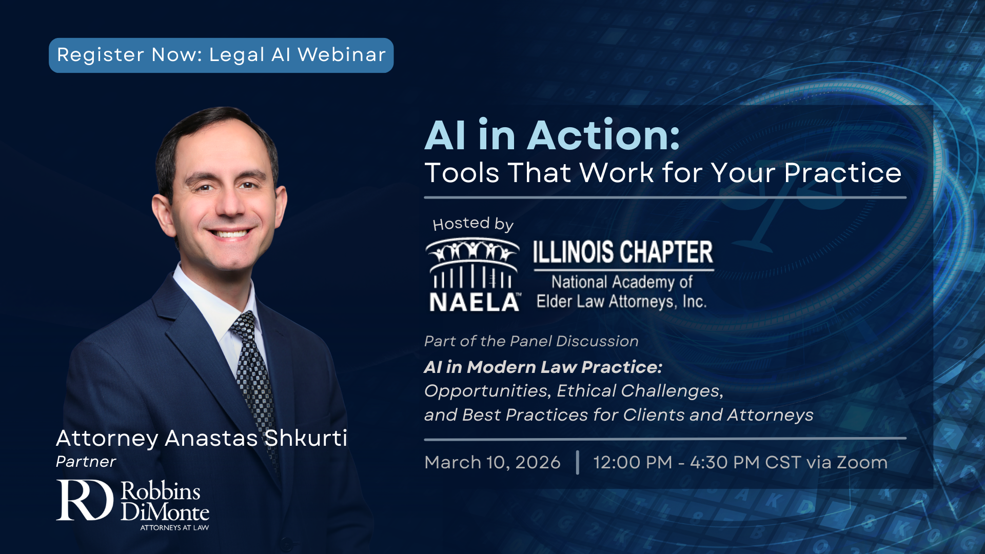 Robbins DiMonte Partner Anastas Shkurti will present “AI in Action: Tools That Work for Your Practice” as part of the Illinois Chapter of the National Academy of Elder Law Attorneys’ (NAELA) upcoming webinar, AI in the Modern Law Practice: Opportunities, Ethical Challenges, and Best Practices for Attorneys and Their Clients.